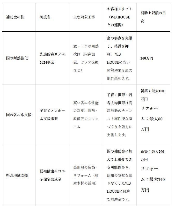 | 補助金の柱 | 制度名 | 主な対象工事 | お客様メリット(WB HOUSEとの連携) | 補助上限額の目安 |