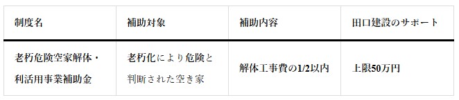 | 老朽危険空家解体・利活用事業補助金 | 老朽化により危険と判断された空き家 | 解体工事費の1/2以内 | 上限50万円 |