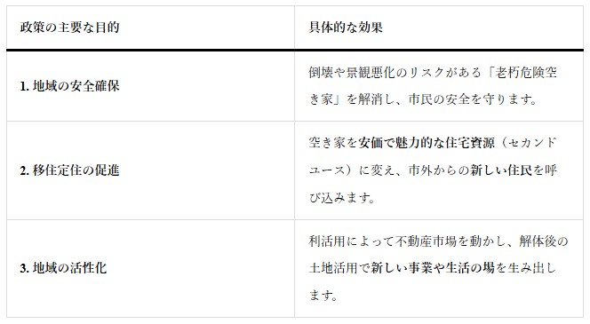 | 1. 地域の安全確保 | 倒壊や景観悪化のリスクがある「老朽危険空き家」を解消し、市民の安全を守ります。 |