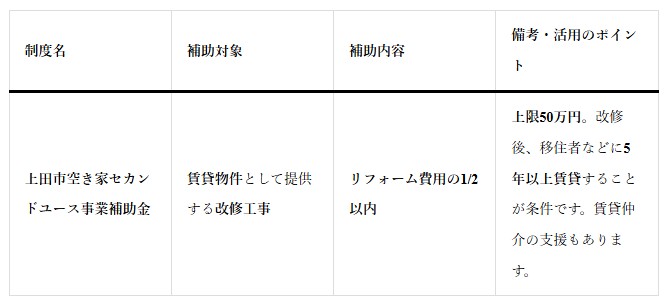 | 上田市空き家セカンドユース事業補助金 | 賃貸物件として提供する改修工事 | リフォーム費用の1/2以内 | 上限50万円。改修後、移住者などに5年以上賃貸することが条件です。賃貸仲介の支援もあります。 |