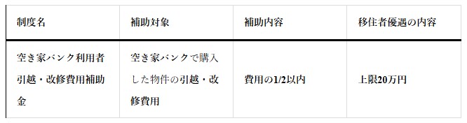| 空き家バンク利用者引越・改修費用補助金 | 空き家バンクで購入した物件の引越・改修費用 | 費用の1/2以内 | 上限20万円 |